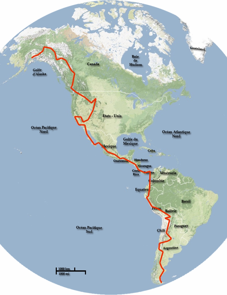 Nous traverserons 14 pays : le Canada, les Etats-Unis (dont l’Alaska), le Mexique, le Guatemala, le Salvador, le Honduras, le Nicaragua, le Costa Rica, le Panama, l’Equateur, le Pérou, la Bolivie, le Chili, l’Argentine.
