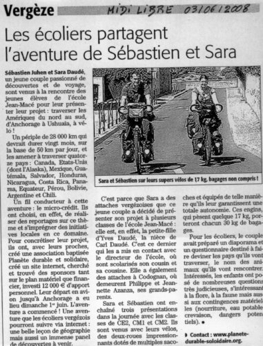 3 Juin 2008: "Les écoliers partagent l'aventure de Sébastien et Sara" dans Midi Libre Gard